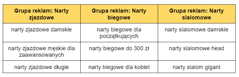 Dobrym rozwiązaniem jest tworzenie grup reklam w oparciu o sekcje lub kategorie, występujące na naszej stronie internetowej. Wyobraźmy sobie sklep internetowy z nartami, np. zjazdowymi, biegowymi, slalomowymi. Zamiast tworzyć jedną, ogólną grupę reklam dla całego sklepu, możemy podzielić nasze produkty na kategorie i stworzyć dla każdej z nich oddzielną grupę. Dzięki temu nasze reklamy będą wyświetlane użytkownikom, którzy szukają konkretnych produktów, co znacznie zwiększy ich skuteczność. Po co bowiem wyświetlać reklamę nart zjazdowych komuś, kto chce kupić biegówki (tzn. kto wpisał w wyszukiwarkę hasło związane z biegówkami)?