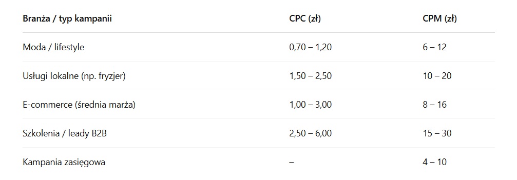 Na rynku polskim, w oparciu o doświadczenia reklamodawców i dane z narzędzi Meta Ads, można wskazać realne widełki kosztów, z jakimi warto się liczyć przy planowaniu budżetu.