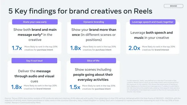 Meta wskazuje, że kreacje, w których marka i główne przesłanie pojawiają się w pierwszych 5 sekundach, są 1,7 raza częściej wśród 20% najlepszych pod względem intencji zakupu.
