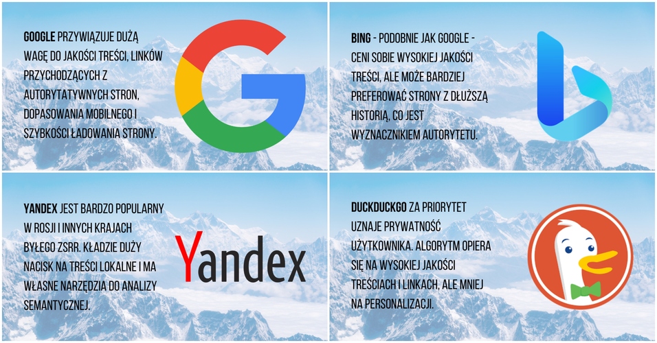 Różne algorytmy - algorytmy innych wyszukiwarek kładą nacisk na nieco odmienne czynniki. Optymalizacja pod kątem kilku wyszukiwarek może pomóc w osiągnięciu lepszych wyników w ogólnym rozrachunku.