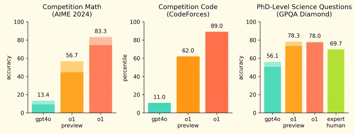 Firma podkreśla, że nowy model będzie szczególnie przydatny dla inżynierów, naukowców, programistów. Na poniższej grafice widać, jak bardzo model o1 przewyższa poprzednie wersje, a także ludzkiego eksperta (w ostatnim przykładzie). Porównań dokonano w oparciu o trzy wyzwania: matematyczne, programistyczne oraz naukowe (na poziomie PhD, czyli naszego polskiego doktoratu).