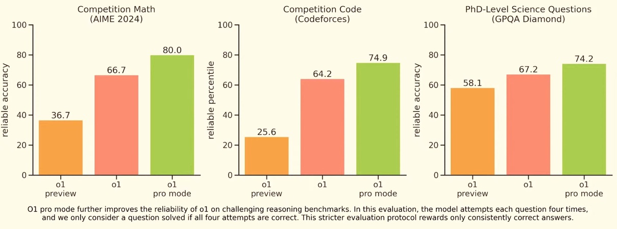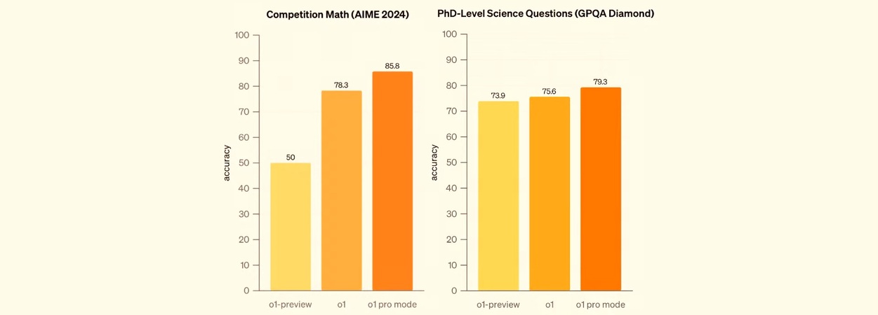 Ponadto firma wprowadza usługę pro. Jak utrzymuje OpenAI, wersja o1 jest obecnie najpotężniejszą na świecie - jeśli nie liczyć jeszcze potężniejszej, jaką jest o1 pro. Na poniższej grafice widać, jak model o1 pro radzi sobie z zaawansowanymi wyzwaniami z zakresu matematyki oraz nauki na poziomie PhD. Owa wersja może być używana w płatnym wydaniu ChatGPT pro.