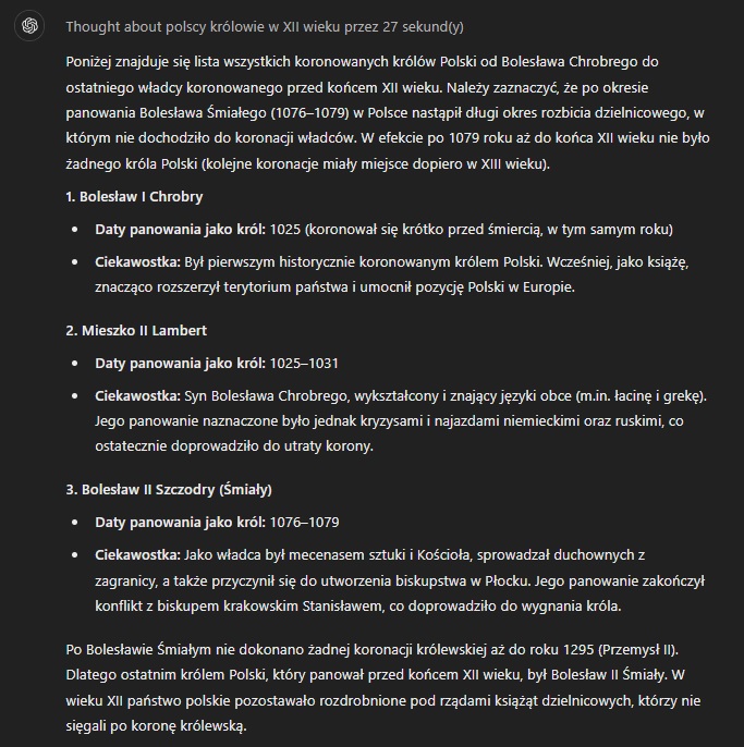 Co istotne, o1 odpowiedział na pytanie bardzo precyzyjnie - w istocie wymienił jedynie królów Polski, czyli władców koronowanych, noszących ten tytuł, a nie niekoronowanych władców (np. książąt), którzy mogli sprawować władzę w mniej formalny sposób - takiej bowiem odpowiedzi udzielił model 4o. Zaproponowane przez o1 informacje pokrywają się z