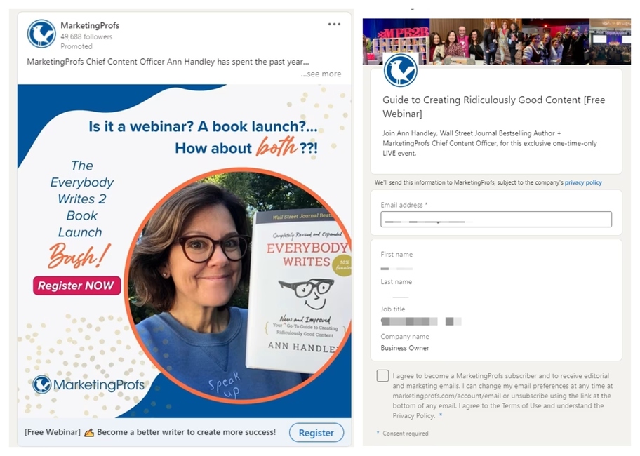 Opis: reklamy z wbudowanymi formularzami, które umożliwiają użytkownikom zapisanie się na wydarzenie lub przekazanie swoich danych bez opuszczania platformy LinkedIn.