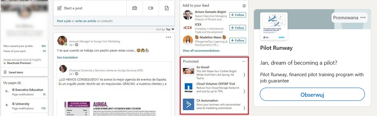 Opis: reklamy dostosowujące się do profilu użytkownika, np. personalizowane zaproszenia do obserwowania strony firmowej lub oferty pracy.