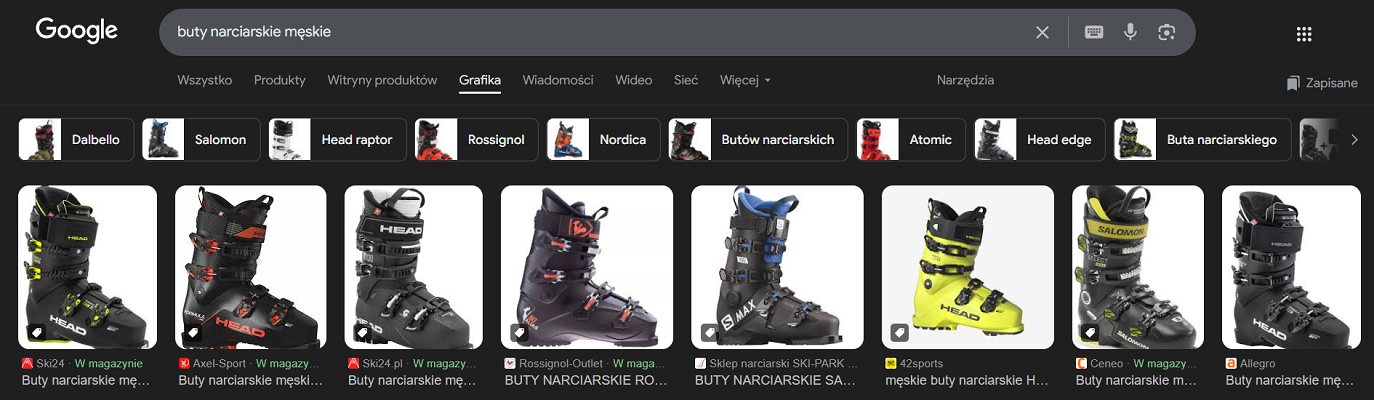 • Grafika Google jest szczególnie istotna dla e-commerce, gdzie sprzedawcy ze sklepów internetowych mogą zaprezentować swoją ofertę w atrakcyjny sposób. Pamiętajmy, że użytkownik, który wpisuje frazę produktową (w tym przykładzie “buty narciarskie męskie”) jest bliższy zakupu niż taki, który wpisuje nieproduktową (np. byłaby to fraza “popularne kurorty narciarskie we Włoszech”).