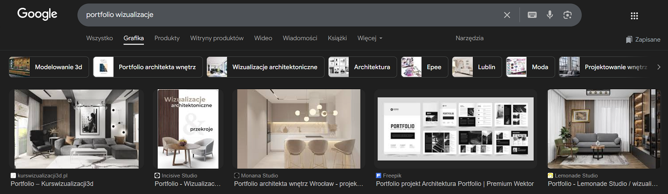 Portfolio wizualizacji w Grafice Google. Dla branż takich jak architektura wizualny aspekt jest istotny na etapie poszukiwania wykonawcy przez zleceniodawcę.